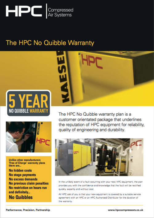 5 Year No Quibble Warranty Reliability is essential when choosing compressed air equipment. This is why you should look no further than HPC and Telford Compressed Air Services Ltd. All HPC compressors come with the option of a 5 year, no quibble warranty plan.