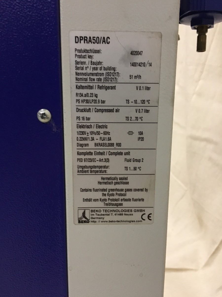 Like New, Beko RA50F Refrigerant Dryer c/w Pre-Filter. Features an energy efficient, Zero Loss Condensate drain.